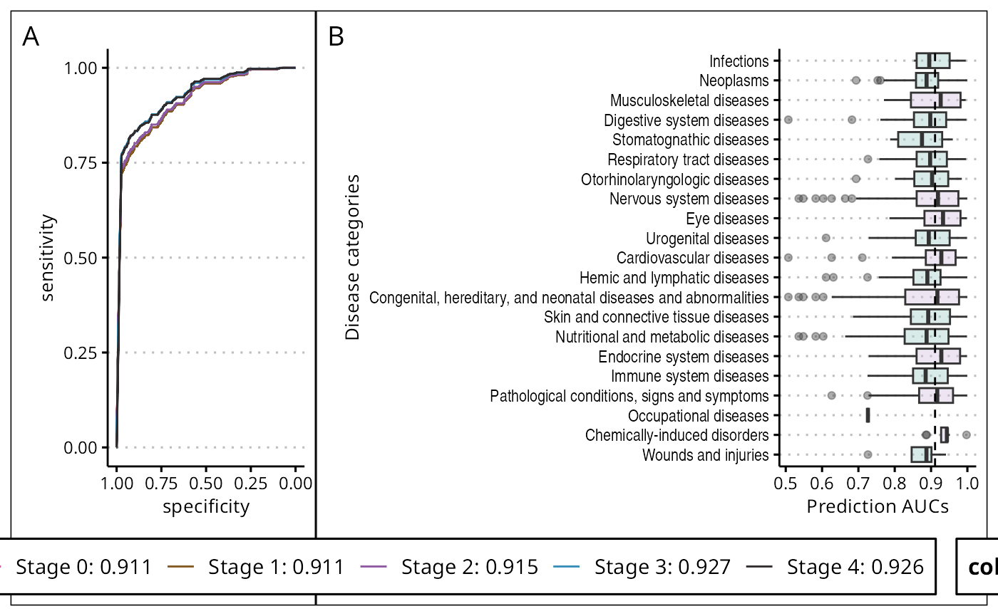 axis.text.y = element_text('Arial Narrow'))Notably, labyrinth exhibited high predictive accuracy in determining drug usability for Stage 3 across all disease categories except for occupational and stomatognathic diseases (Figure 3B). Also, cardiovascular, endocrine system diseases, and neoplasms garnered the most significant benefits from labyrinth. Detailed ROC-AUC predictions for all diseases are provided in Additional File 1.